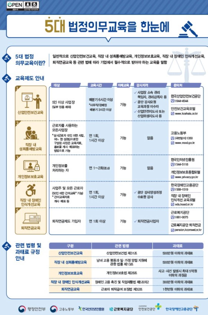 - 산업안전보건교육, 직장 내 성희롱 예방 교육, 개인 정보 보호 교육, 직장 내 장애인 인식 개선 교육, 퇴직 연금 교육, 직장내 괴롭힘 교육 --> 법에 따라 기업에서 필수로 받아야 하는 교육임